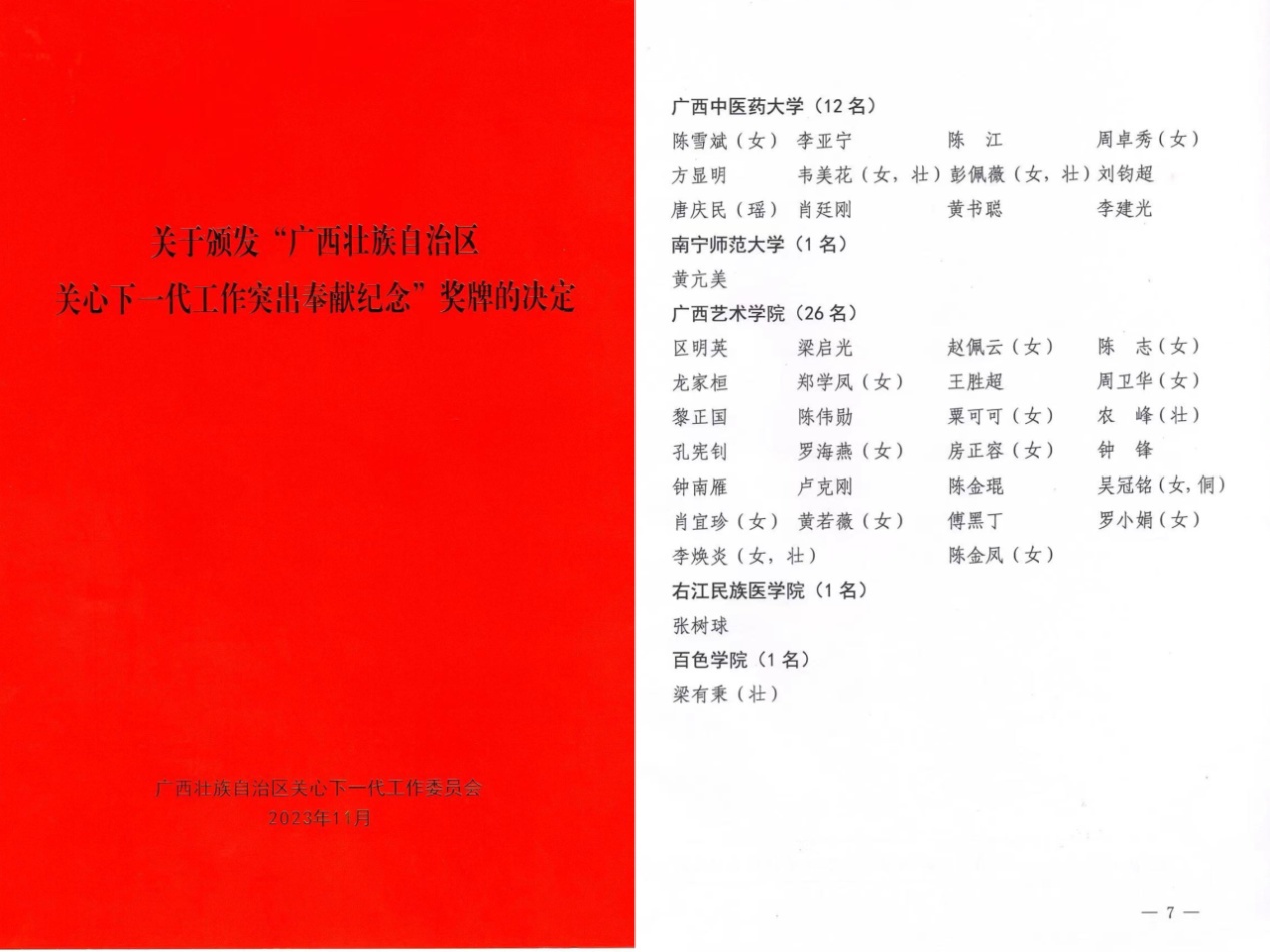 喜报:我校区明英等26位老同志荣获“广西壮族自治区关心下一代工作突出贡献纪念”奖牌 来源:离退处 作者: 时间:2023-12-15 16:56 点击:次 字号:【小 大】 近日,自治区关工委首次颁发“广西壮族自治区关心下一代工作突出奉献纪念”奖牌,对全区从事关心下一代工作满10年(含10年)以上、一贯表现良好且年满70周岁的248名有关单位关工委领导同志进行表扬。我校区明英等26名同志荣获该奖牌,我校也是获得该项荣誉人数最多的高校。这26名同志退休后一直在关工战线上发光发热,为学校关工委工作作出了贡献。自治区关心下一代委员会表彰获奖名单“广西壮族自治区关心下一代工作突出奉献纪念”奖牌颁发仪式合影 分享到: 【打印正文】