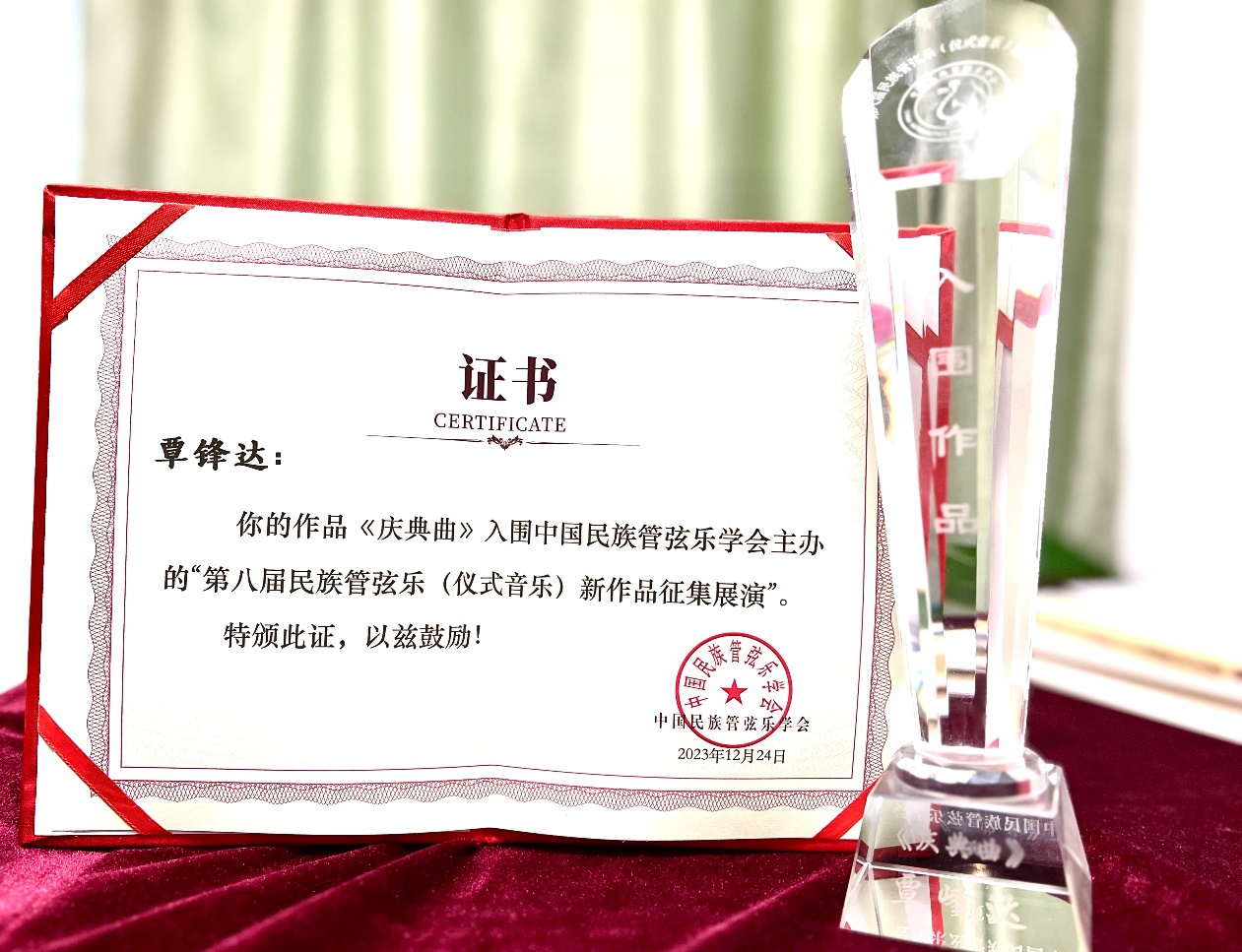 近日,由中国民族管弦乐学会主办的“第八届民族管弦乐(仪式音乐)新作品征集展演音乐会”暨颁奖典礼在北京金帆音乐厅圆满落幕。我校青年教师覃锋达的民族管弦乐队作品《庆典曲》在众多参赛作品中脱颖而出,荣获“第八届民族管弦乐(仪式音乐)优秀新作品”。