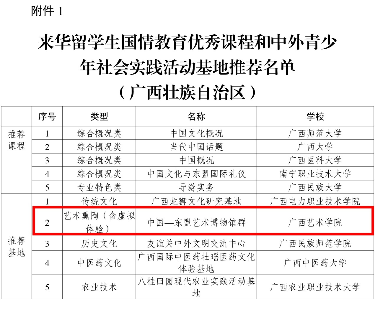 近日,教育部国际合作与交流司委托中国教育国际交流协会开展的首批“来华留学生中国国情教育优秀课程和中外青少年社会实践活动基地”评选结果揭晓,我校“中国—东盟艺术博物馆群”成功入选。本次评选工作于2024年在全国范围内展开,采用“学校自愿申请、地方统筹推荐”的方式进行。经专家严格研究和审定,最终全国共有115个基地入选。