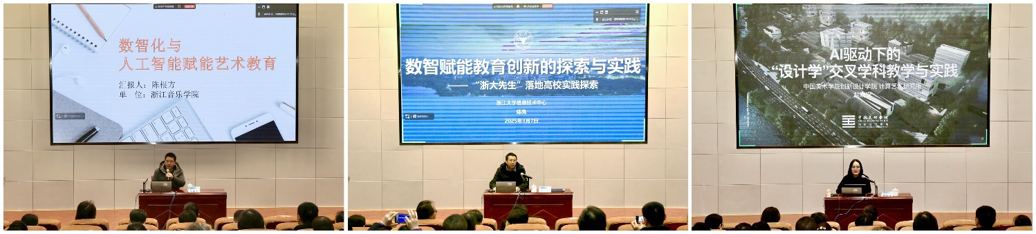 3月7日,来自中国美术学院、浙江大学、浙江音乐学院的三位专家作了专题分享。中国美术学院创新设计学院计算艺术研究所所长胡晓琛以“AI驱动下的‘设计学’交叉学科教学与实践”为主题,解析人工智能在推动设计学科跨界融合中的创新教学模式与实践案例;浙江大学信息技术中心教育技术部副部长陈亮聚焦“数智赋能教育创新的实践与探索”,系统展示智能教育平台建设成果及数据驱动下的教学管理模式升级路径;浙江大学音乐人工智能联合实验室主任围绕“数智化与人工智能赋能艺术教育”,结合音乐领域的实践,探讨技术赋能艺术学科发展的前沿方向。专家们的报告立足学科交叉与技术创新,为与会者提供了多维度、深层次的实践启示。