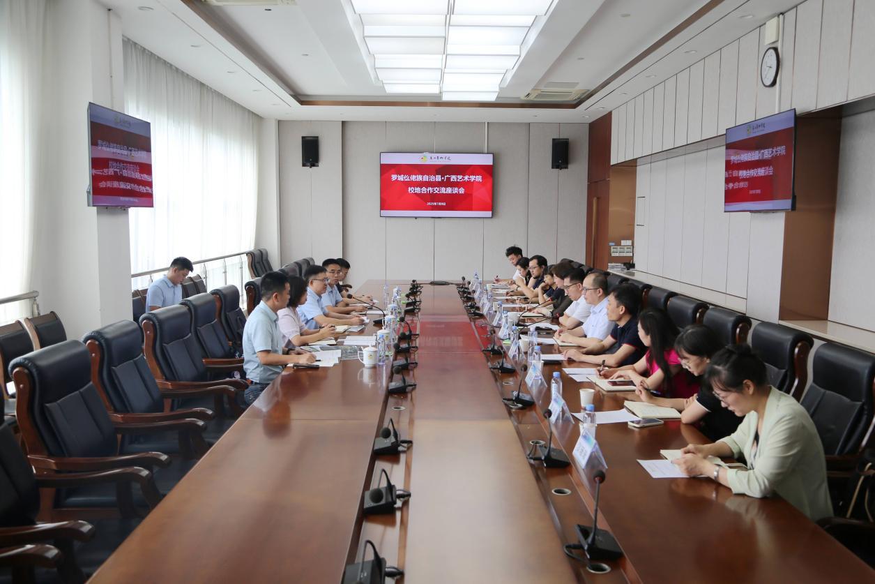罗城仫佬族自治县人民政府副县长蓝天宝、县委办公室、县文广体旅局,学校党办院办、发展规划处、影视与传媒学院、造型艺术学院、设计学院、建筑艺术学院、校团委等相关部门单位代表参加了座谈会。