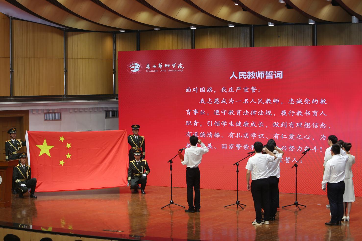 大会举行了新聘教职工入职宣誓仪式。学校领导刘伯贤、韦俊平为新入职的教职工颁发校徽。新聘教职工面对国旗庄严宣誓。