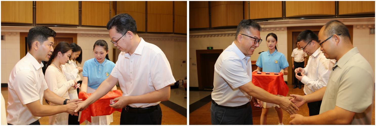 学校领导为新聘教职工颁发校徽